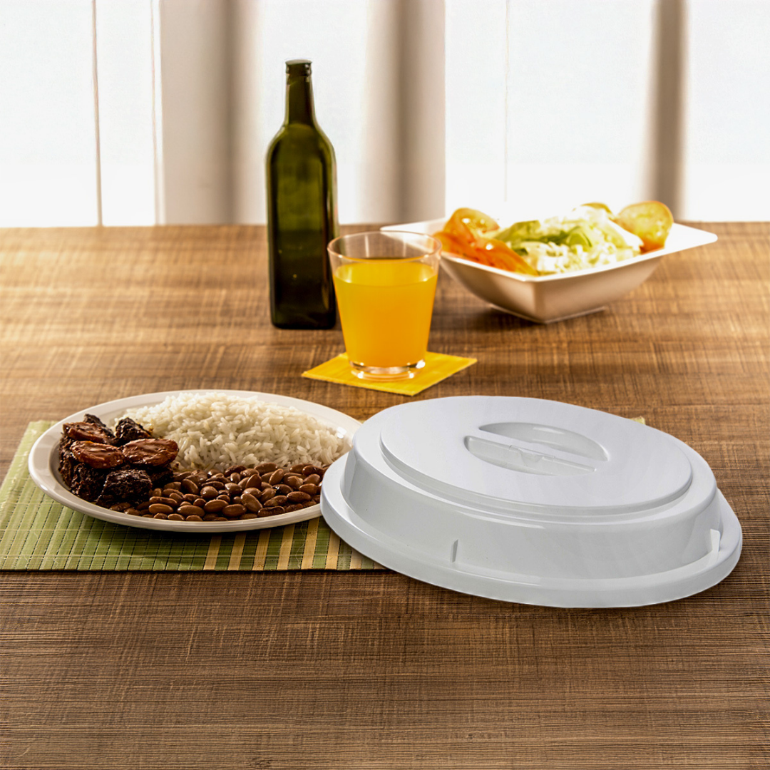 Seu design transparente permite visualizar completamente os alimentos, valorizando a apresentação sem comprometer a segurança. Além de proteger contra agentes externos, o cloche contribui para a conservação térmica das refeições, auxiliando no controle de temperatura durante o serviço ou transporte.