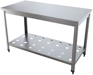 Essa mesa é feita com aço inox escovado, o que significa que não enferruja, é super fácil de limpar e ainda tem aquela aparência profissional que passa confiança. O tampo é liso – ou seja, sem reentrâncias ou detalhes complicados. Isso faz com que a limpeza seja rápida e sem stress.